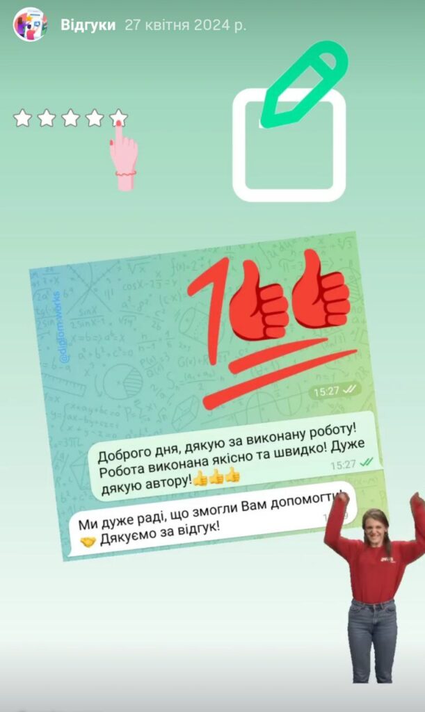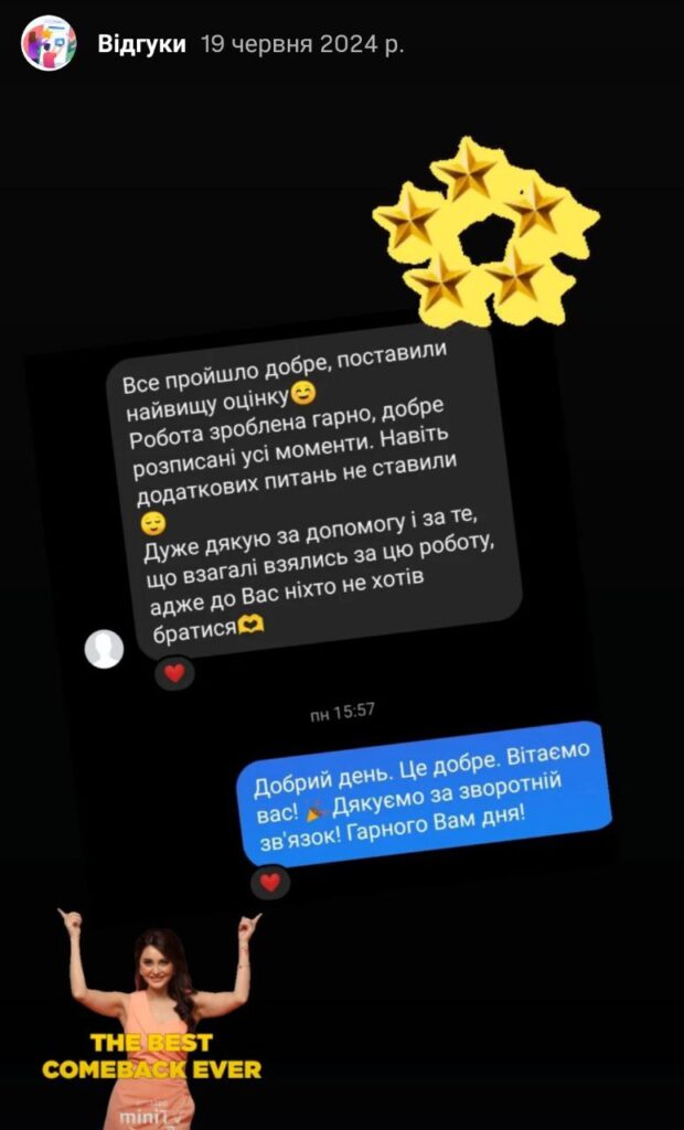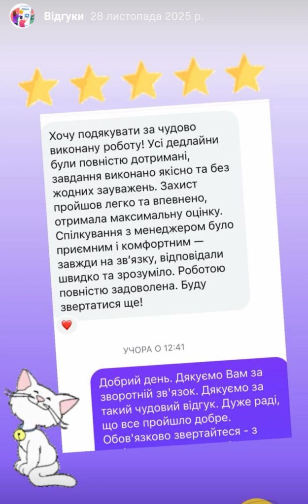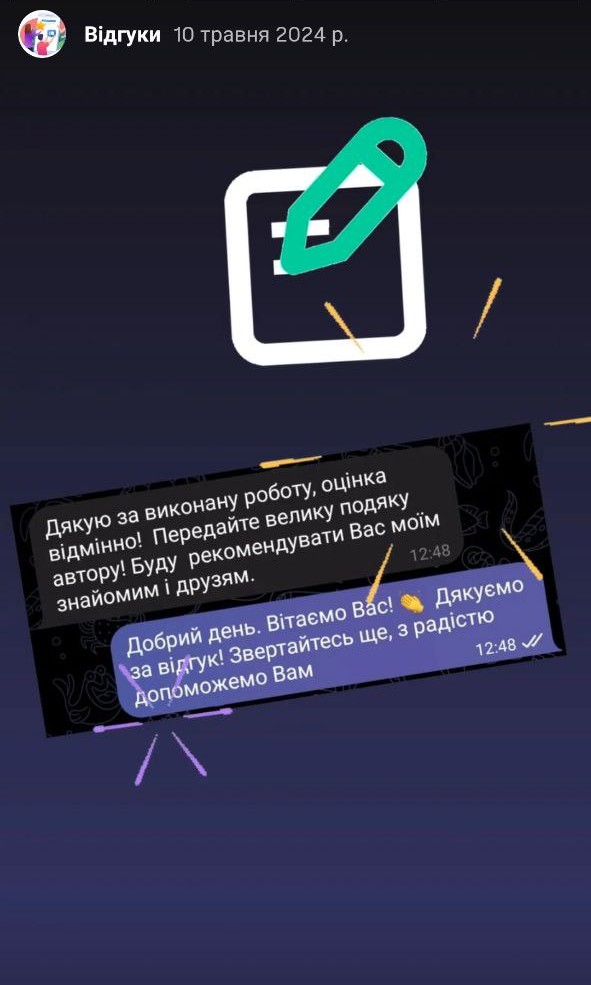 Дуже дякую за написання дипломної роботи. Робота написана якісно. Доопрацювання своєчасні. Підтримка постійна, на всі питання відповідали оперативно. Унікальність роботи висока. Довели до захисту. Захистилася! Рекомендую всім!